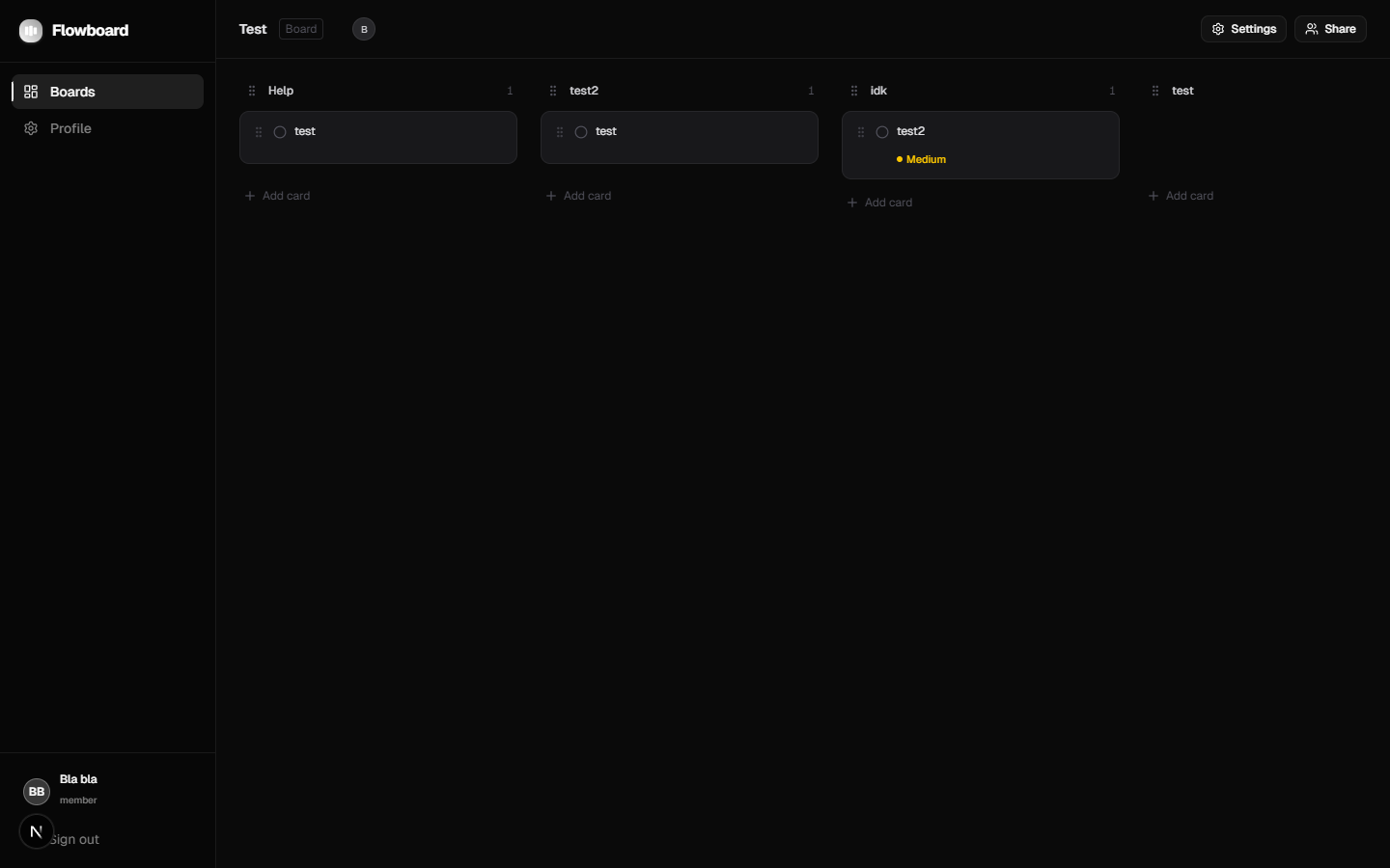 Fluid drag-and-drop across columns with fractional indexing — positions never conflict. Undo any move with Ctrl+Z. Touch-optimised for mobile too.